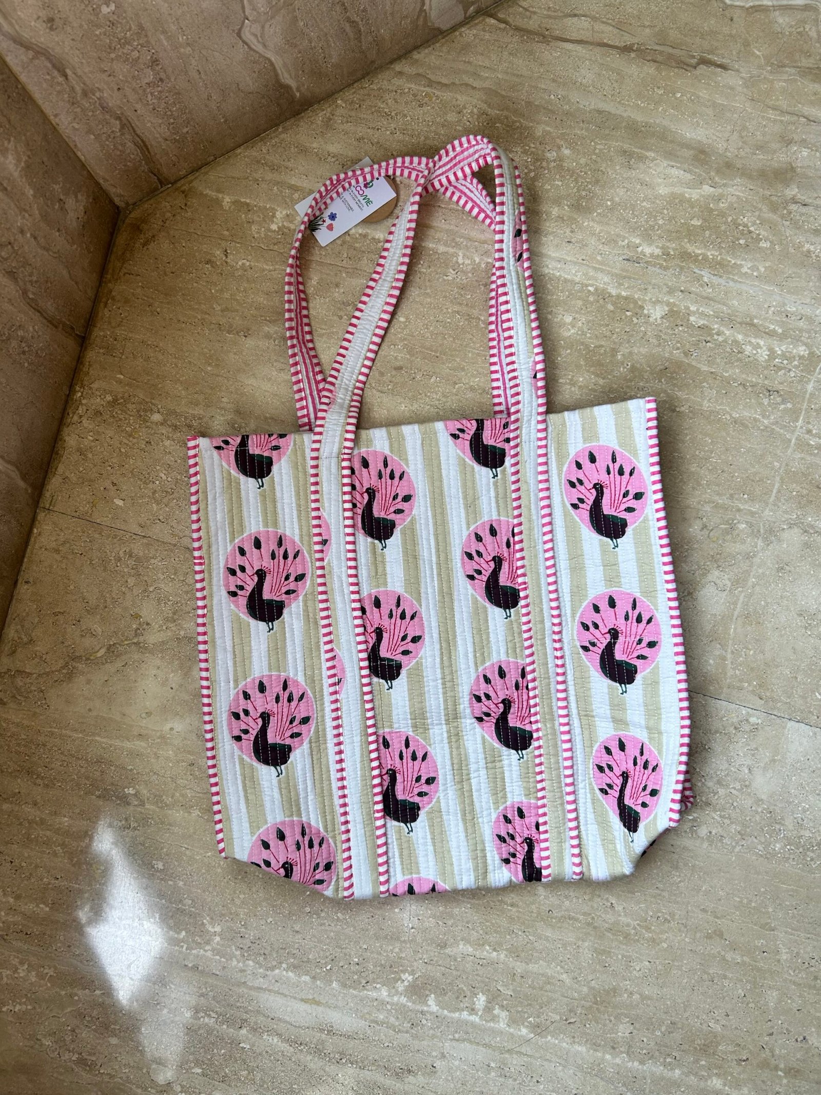 Peacock beige blush stripe Cotton Quilted Tote Bags for everyday use (without zip closure)